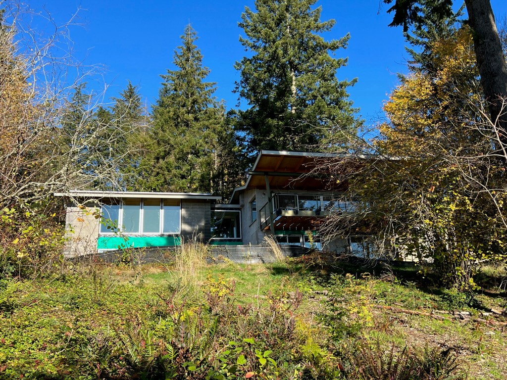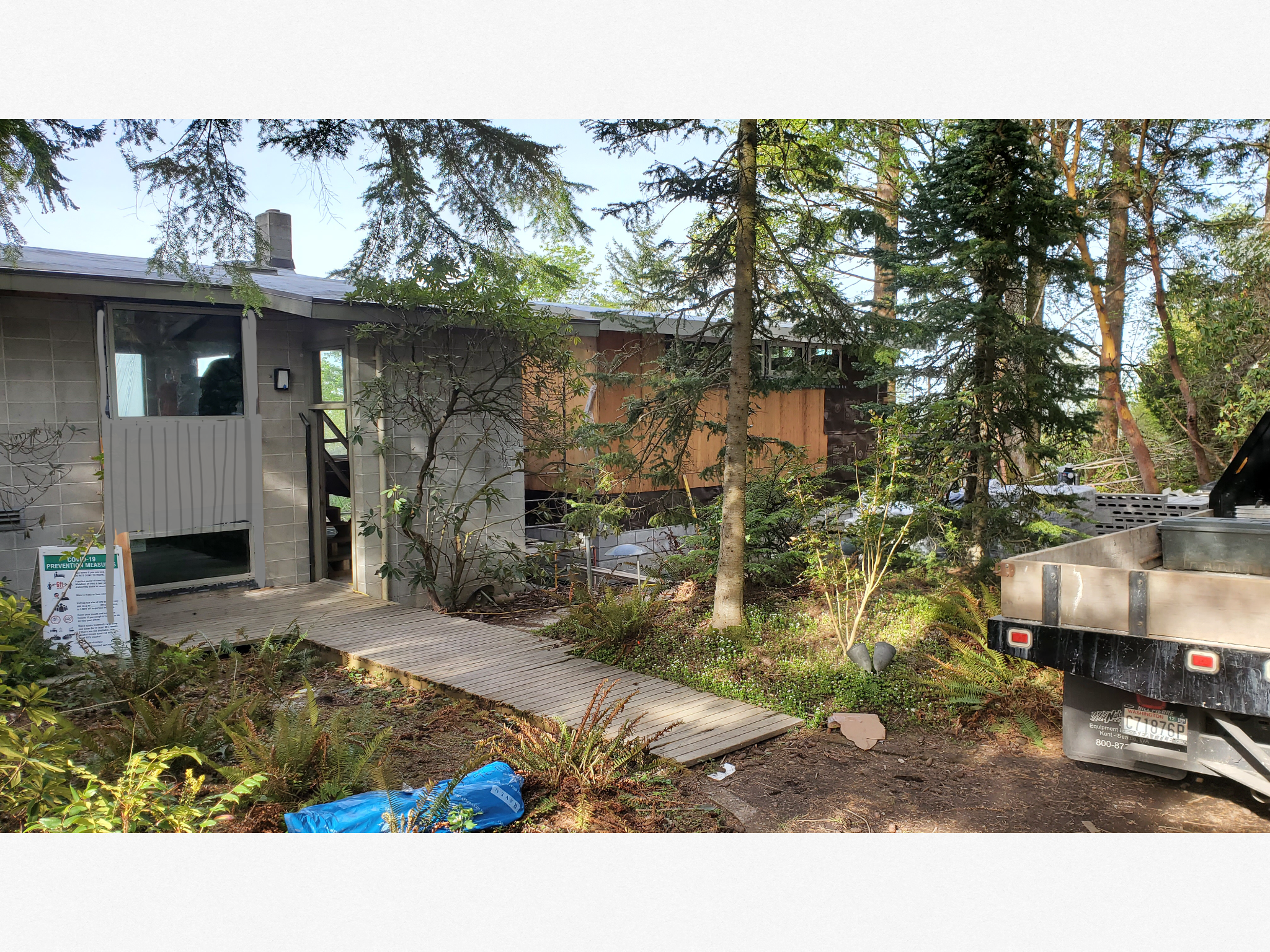 The view from the back looking up into the house where you can see the sky bridge connection the addition on the left which houses the primary bedroom and office/garage below it.