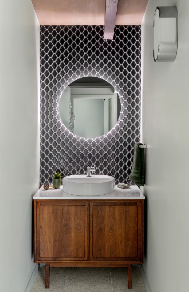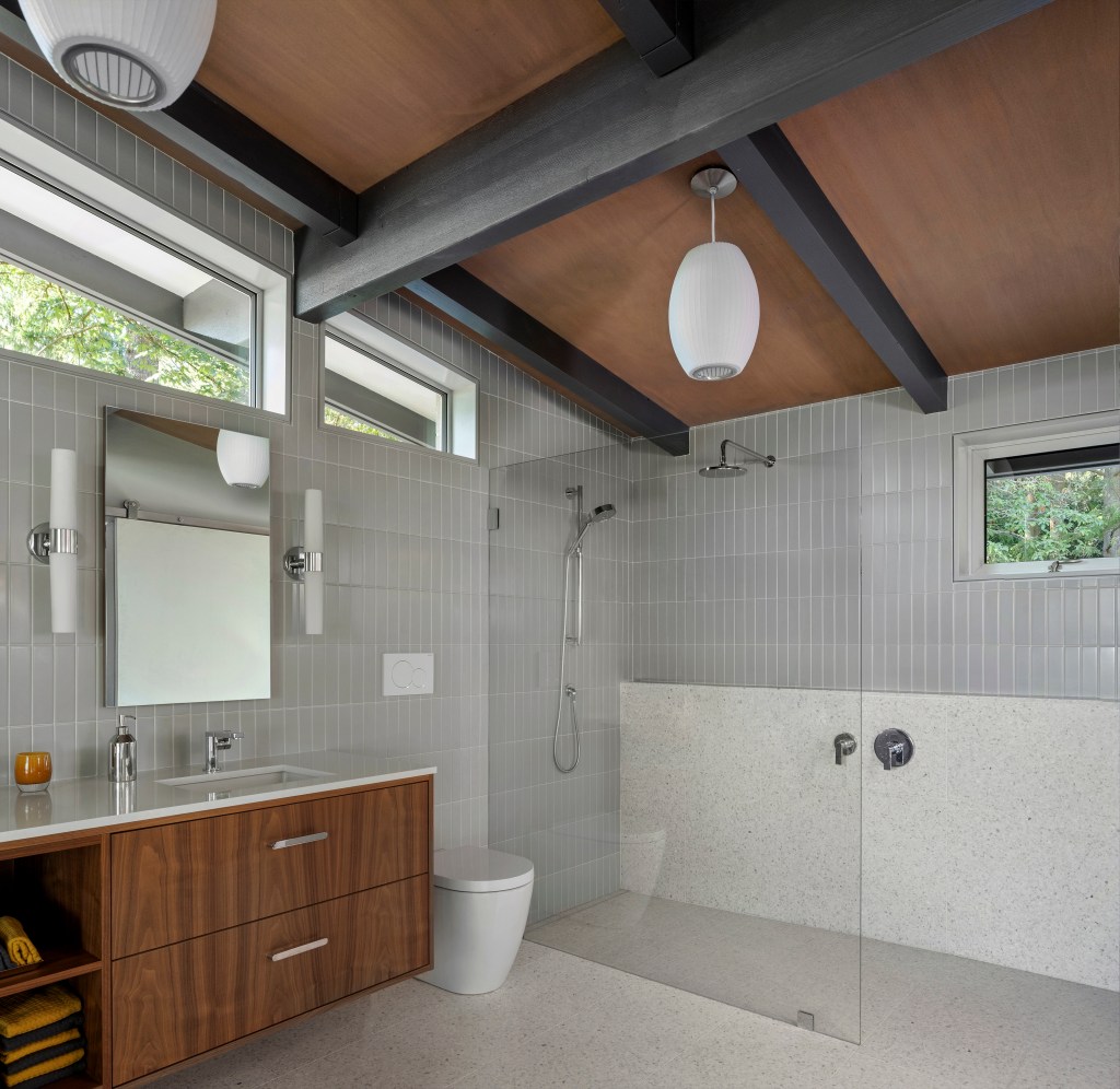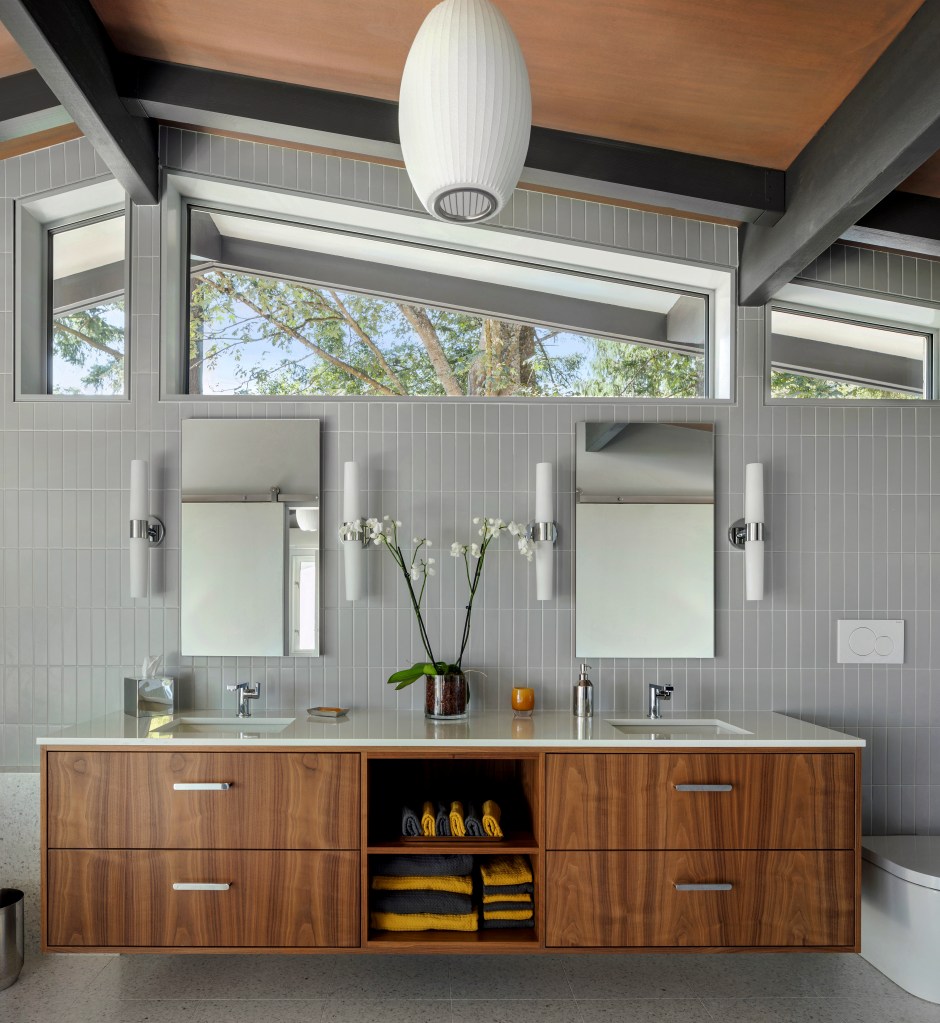 The bathrooms throughout the house have continuity but each with its own personality. From the 1960’s cabinet vanity in the powder room to the elongated 8 foot wide credenza vanity in the primary bedroom bath to the compact downstairs bath each has a mix of wood, clean tile work, in wall water closets for the toilets, and the same general tap wear that works with our “northwest Bauhaus” aesthetic.