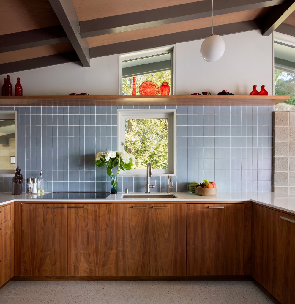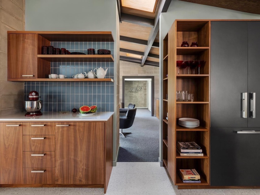 We found some very cool pulls that are solid brass and very blocky. Totally in keeping with the vernacular of the house. The blue tile really did pop nicely and creates a beautiful backdrop for the open shelves with under lighting. The ceilings that we sanded the white paint off of ended up blending nicely with the rest of the house. The beams were painted gray and we did a tan-ish wash over the plywood ceilings everywhere else.