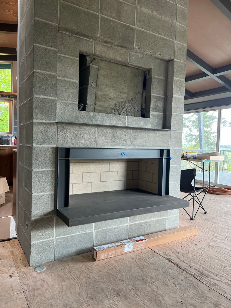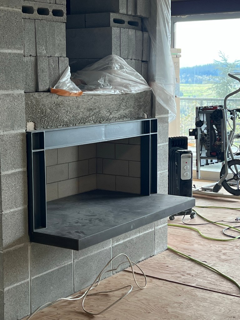 Moving the freestanding fireplace from the outside wall to an integrated built in on the inner utility stack turned out to be more complex and costly than we had anticipated. Part of the design goal was to flip the room around and have it face the views. We really wanted to utilise the Samsung Frame art wall/tv to hide the TV a bit and come off more like a hung picture. By the time we were finished I’d say we failed as it looks very much like an inset TV but the overall structure and approach was successful. To keep the fireplace open we had to install electronic dampers at the roof. We utilised the same steel frame design from the main outside slider for visual continuity. The fireplace now acts a central anchor to the room and sets up the room well.