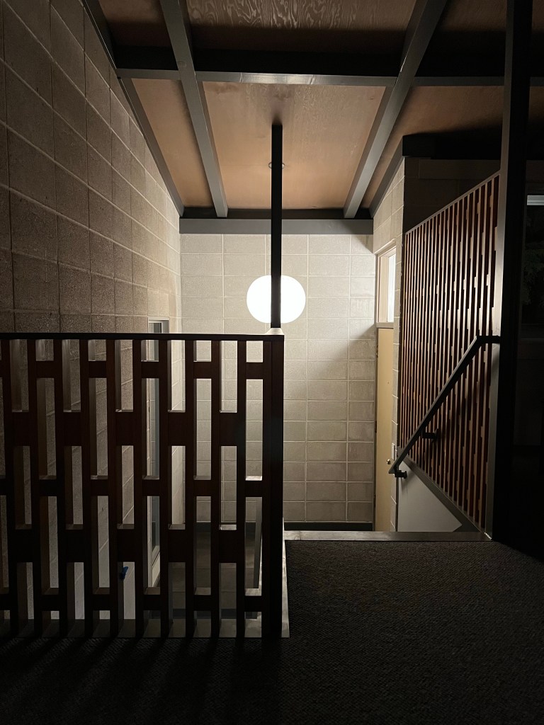 The entry really took shape as well. It was a bit of a bear to build but thankfully once we got a good craftsman in place it not only sped up but the crispness of the details shown through. The design details that Rick, the architect, came up with are totally appropriate to the mid century aesthetic and add some much needed warmth to the space. The combination of the steel beams, the wood railing and the poured concrete steps really make the entrance a statement piece. The iconic George Nelson Bubble Lamp complements the space. So, though it’s compact it makes a nice impression as you enter. Pulling the stairwell more into the space was a good move as well as it makes each tread about 2” deeper than the original staircase. Overall we are very happy with the way this part of the home turned out.